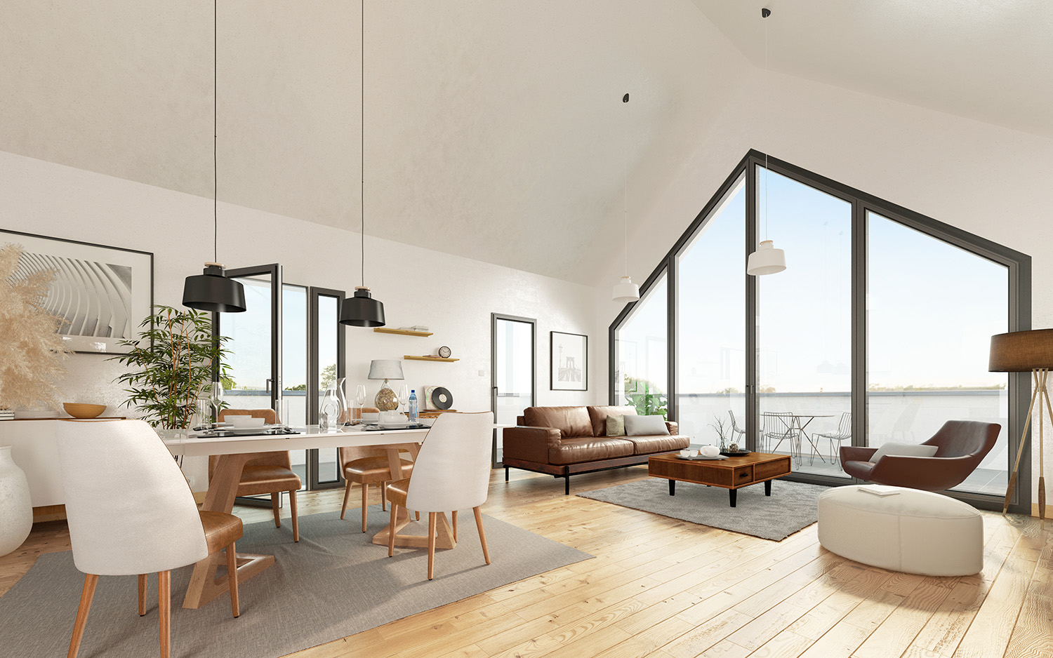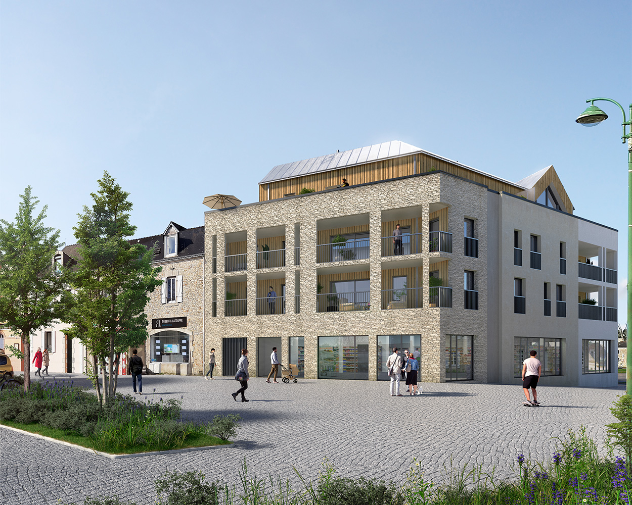 Le projet cherche à réconcilier l’échelle domestique du bourg traditionnel et les ambitions contemporaines de densification douce de la ville. L’architecture repose sur des volumes fractionnés, un socle minéral en pierre jusqu’au R+2, des bardages bois en attique et une toiture à doubles pentes, en écho au tissu historique environnant.