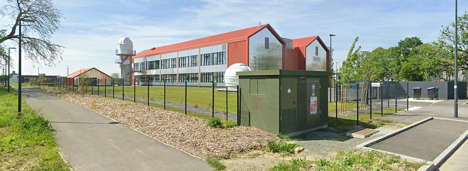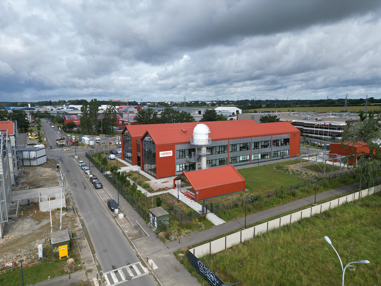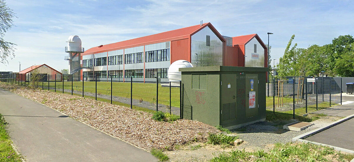 L’élément central est traité avec des vitrages verticaux, complétés par des brise-soleil horizontaux métalliques, apportant une protection solaire et une profondeur visuelle à la façade. La volumétrie reste sobre mais imposante, à l’image de l’activité technologique qu’elle héberge. Un élément marquant du site est la présence d’un observatoire cylindrique en toiture, qui renforce l’image scientifique et innovante du bâtiment. Le bâtiment affirme clairement son usage technologique et sa vocation scientifique.