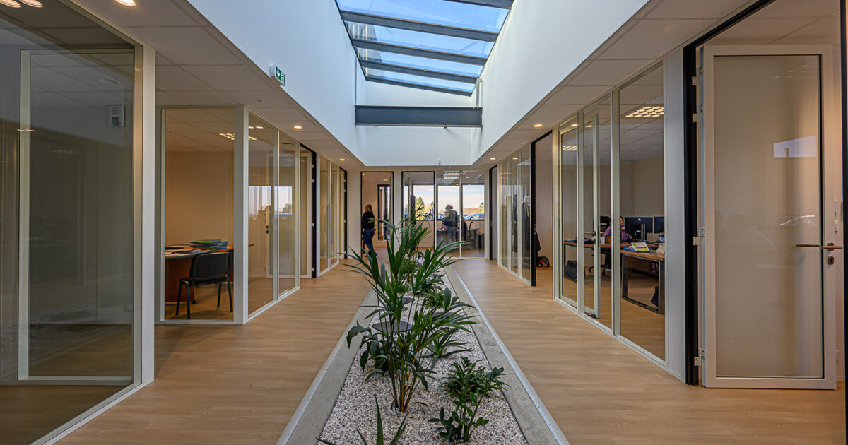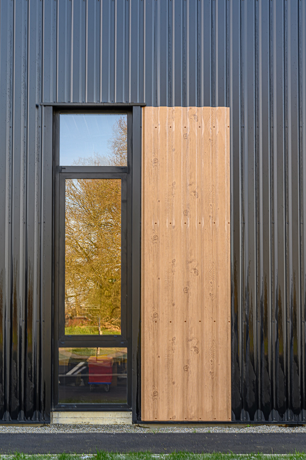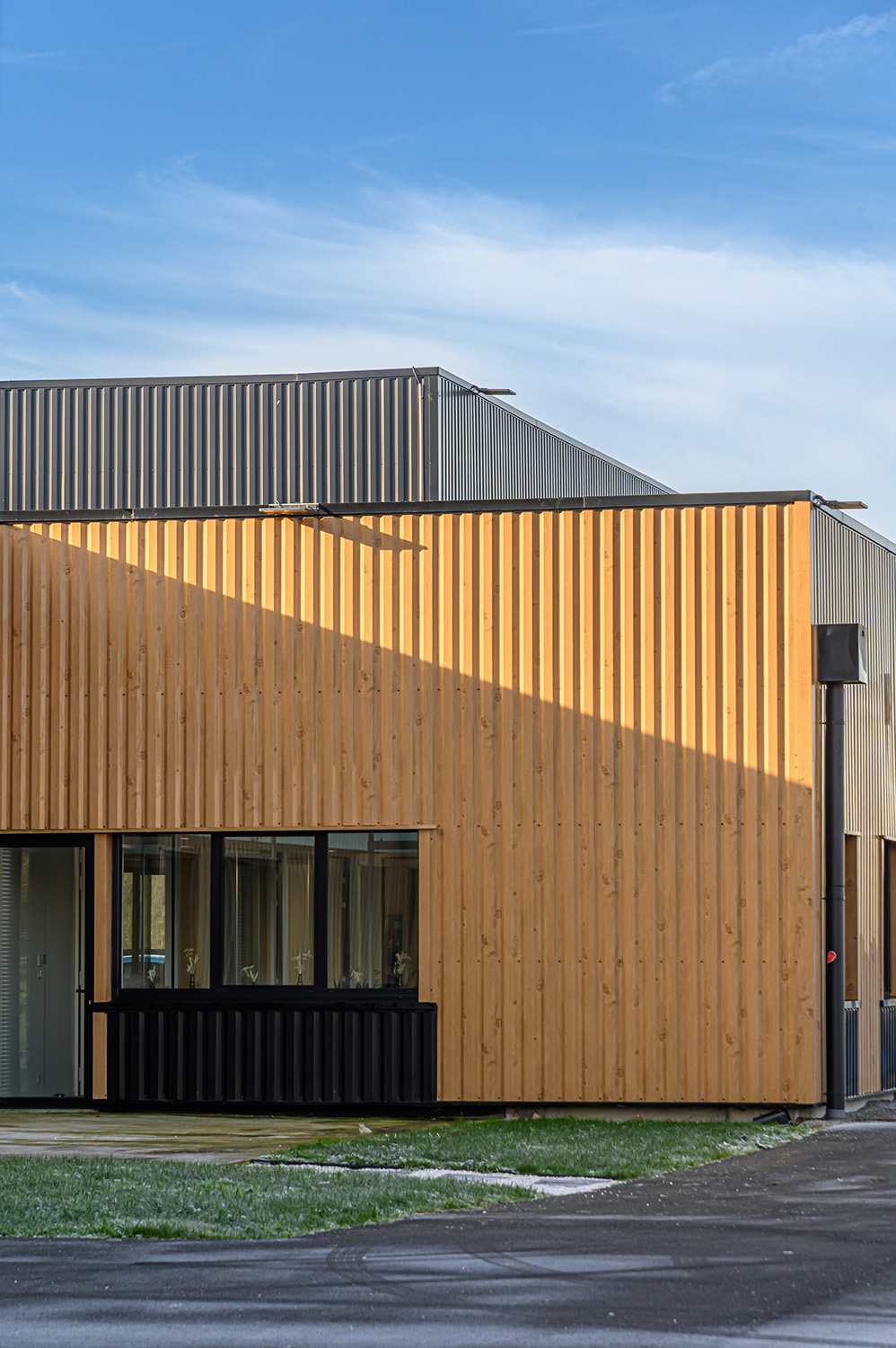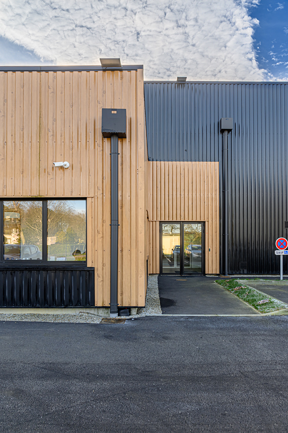 Fonctionnalité et sobriété guident le projet : trois zones de stockage, une chambre froide dédiée aux probiotiques, huit salles de fabrication et quatre de conditionnement structurent le bâtiment. L’architecture adopte des volumes épurés habillés de bardages métalliques noirs et de bois, affirmant une image contemporaine et rigoureuse, en cohérence avec l’activité de l’entreprise.